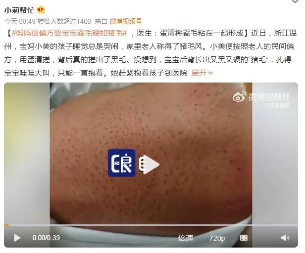近日,浙江温州,宝妈小美的孩子睡觉总是哭闹,家里老人称得了猪毛风。小美便按照老人的民间偏方,用蛋清搓,背后真的搓出了黑毛。没想到,宝宝后背长出又黑又硬的“猪毛”,扎得宝宝哇哇大叫,只能一直抱着。她赶紧抱着孩子到医院就诊,医生清洗了宝宝皮肤,硬毛刺瞬间消失。