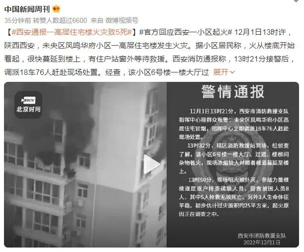 12月1日13时许,西安未央区凤鸣华府小区一高层住宅楼发生火灾。据小区居民称,火从楼底开始着起,很快蔓延到楼上,有住户站窗外等待救援。西安消防通报称,13时21分接警后,调派18车76人赶赴现场处置。经查,该小区6号楼一楼大厅过道杂物着火,现场浓烟较大,并顺着楼道蔓延至楼上。13时50分,现场明火被扑灭,随后消防队员逐层逐户排查疏散人员,营救被困人员8人。其中5人抢救无效死亡,另外3人生命体征平稳。